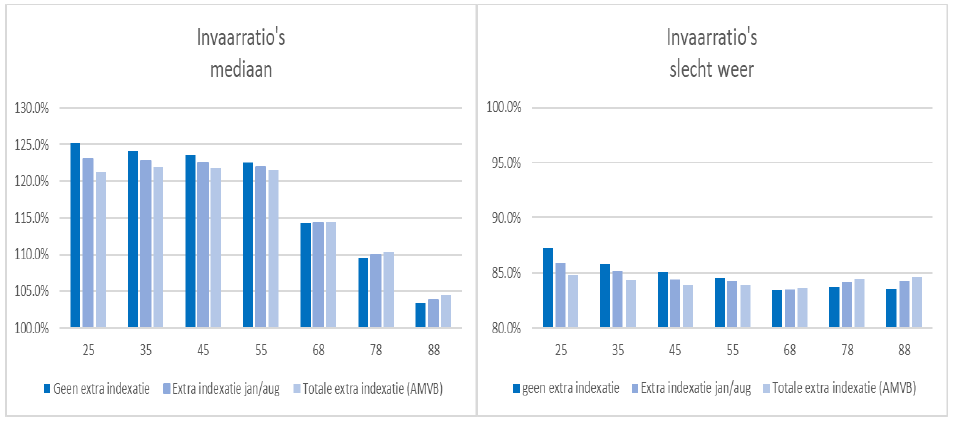 Uit deze berekeningen blijken de voorgestelde indexaties een beperkte impact te hebben op de invaarratio’s en impact voor de verschillende generaties met de verwachte gevolgen (voor ouderen iets gunstiger dan voor jongeren). Hierbij valt op te merken dat de invaarratio’s meer evenwichtig worden wat komt omdat ouderen, door sterfte, in het model minder profiteren van “het uitdelen van de buffer” in het nieuwe pensioencontract.