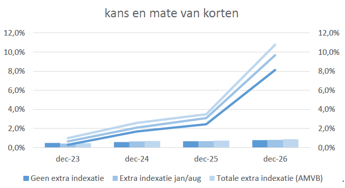 Hier zien we dat bij gebruik van het volledige indexatiemogelijkheden de kans op korten in 2026 stijgt van 8% naar 10,8%. De omvang van een dergelijke korting blijft dan onveranderd < 1% .